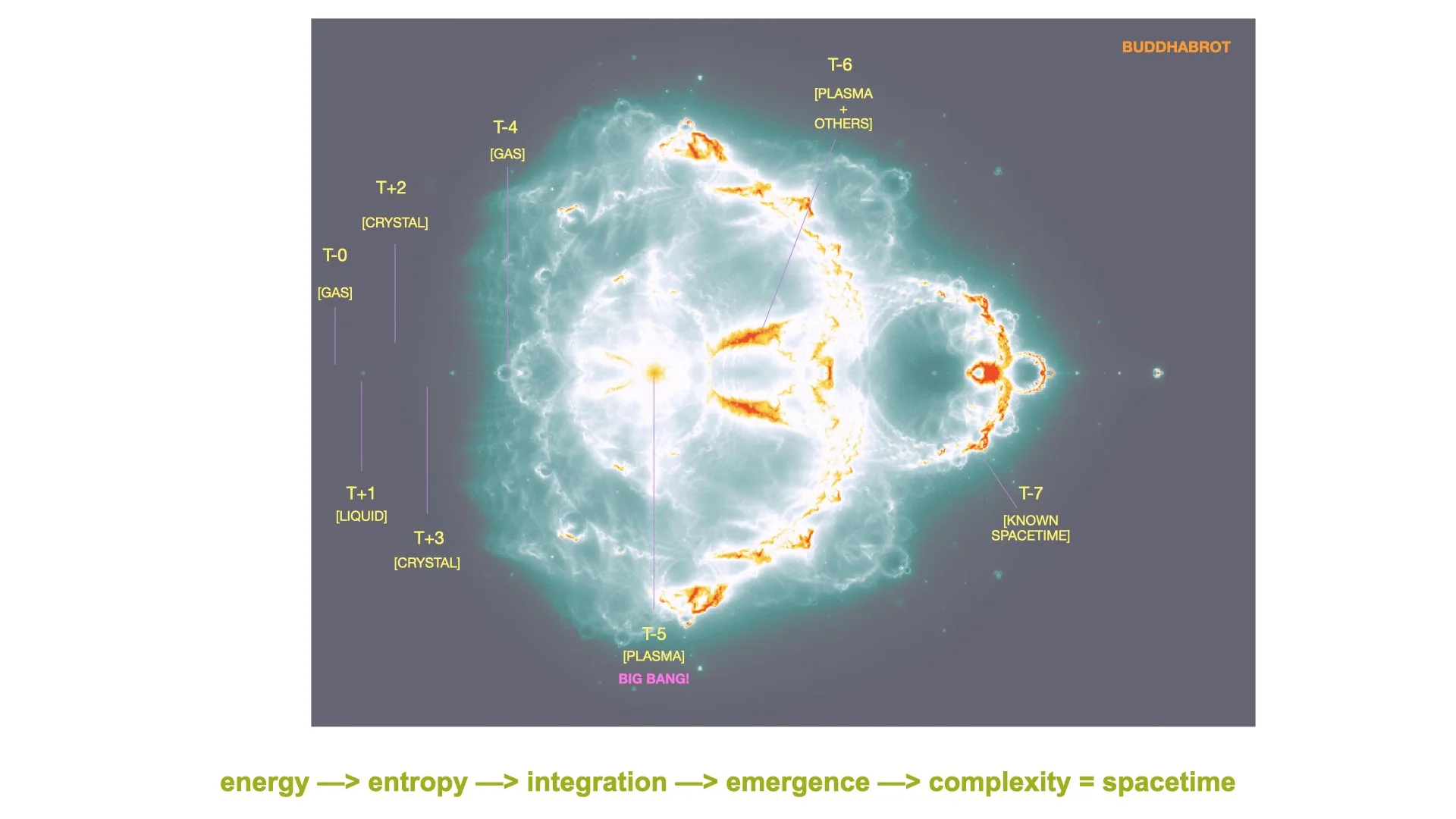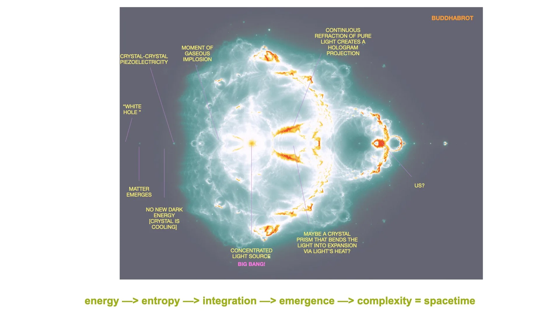 - Upon some manipulation of the layers, the Buddhabrot seems to depict a chain of lattices stacked underneath a curved lattice, lettuce cup-like, that has a mass "bouncing off" or perhaps through its center, and is suspended high above. This "bouncing" mass is illuminated via a main lightsource and its refractions — the placement of this light source would suggest it depicts the Big Bang, if we're using our Mandelbrot "map" — funneled through a very small pinhole and spreading out via a cone-like structure. The densest areas of dark energy are limited and concentrated towards the "end" of the map.